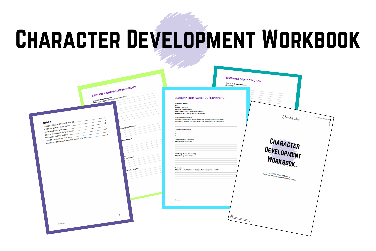 Fillable workbook with questions to answer to create your characters.